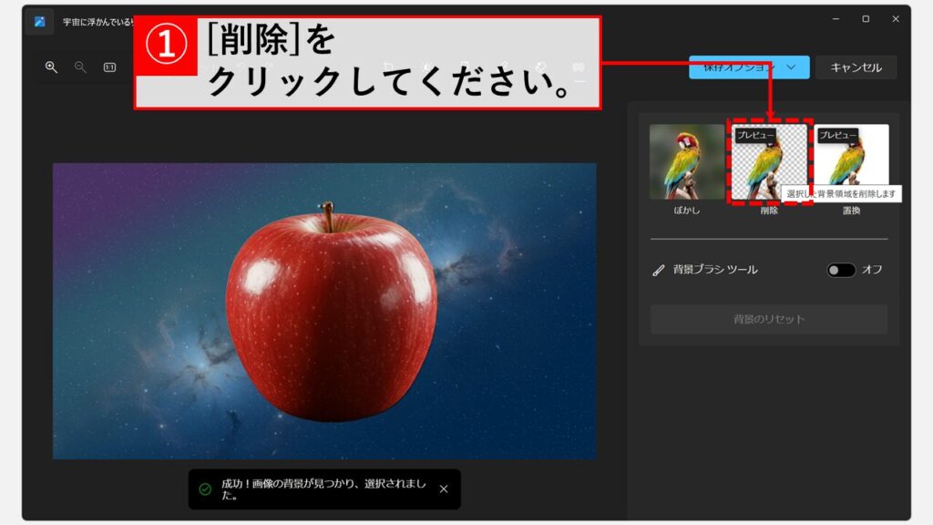 まず、画像をMicrosoft フォトで開いたら「背景」ボタンをクリックし、右側にある「削除」をクリックして背景を削除します。