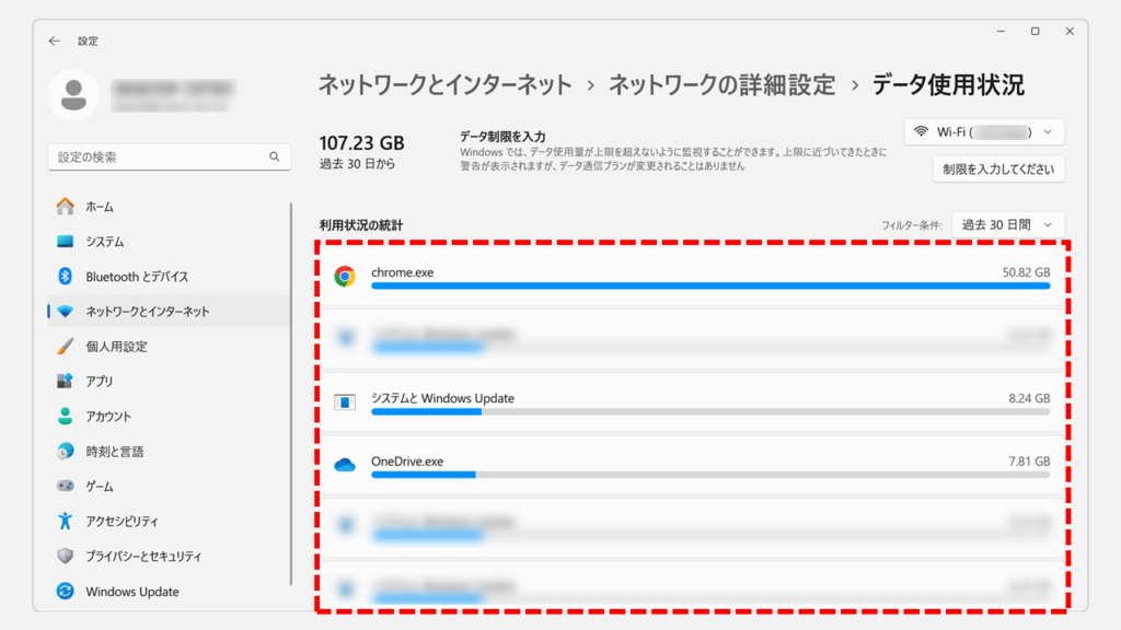 Windows11では、過去一定期間(24時間/7日間/30日間)にパソコンがどれくらいのデータ通信を行ったか、そしてどのアプリが多くのデータを使っているかを以下の手順で簡単に確認できます。