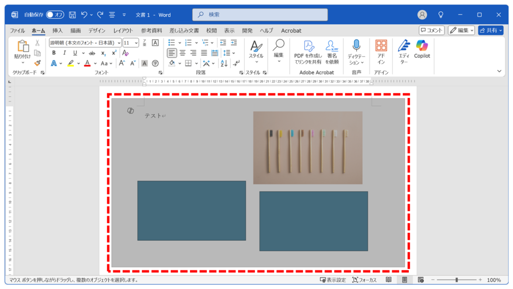 この状態で、選択したいオブジェクトをすべて囲むように、文書上でマウスをドラッグ(クリックしたまま移動)してください。